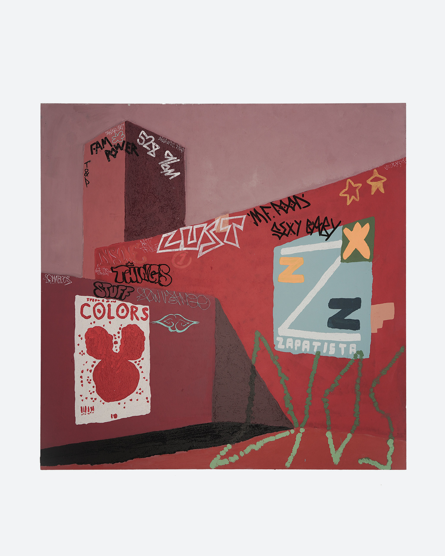 CANVAS, PLYWOOD, CARDBOARD, ACRYLIC, SAND, OIL, AEROSOL, LOVE, ETC